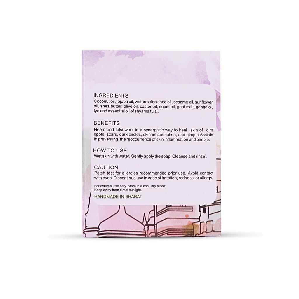Crafted with a blend of nourishing oils including Coconut oil, jojoba oil, watermelon seed oil, sesame oil, sunflower oil, shea butter, olive oil, castor oil, neem oil, goat milk, gangajal, Lye and essential oil of Shyama tulsi.
